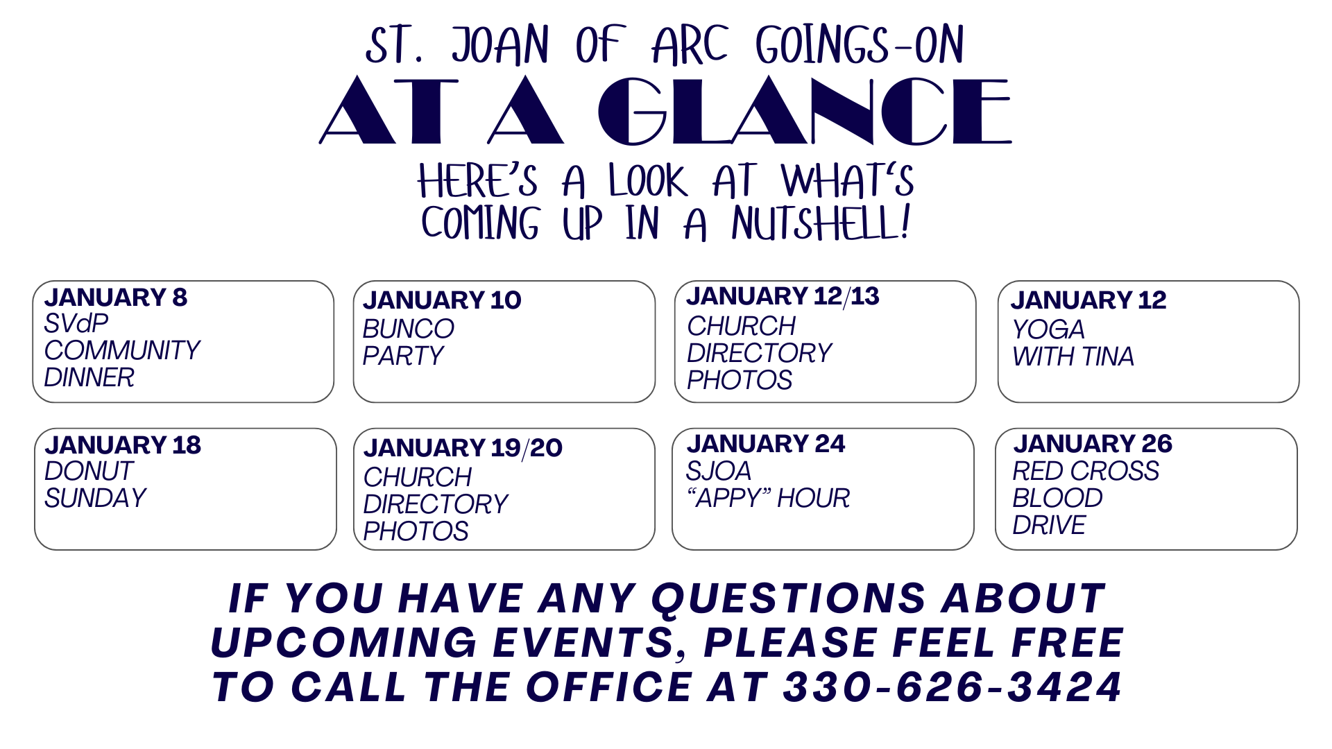 Whether you're already a parishioner, or a visitor locally or from out of town, we wish you a heartfelt welcome. Thank you for visiting our website! Here at St. Joan of Arc, we are a Catholic community open to all. Our church offers many opportunities to be involved, which you can find here on our website. Most importantly, we invite you to join us at our masses for fellowship, and worship of our Lord Jesus Christ.