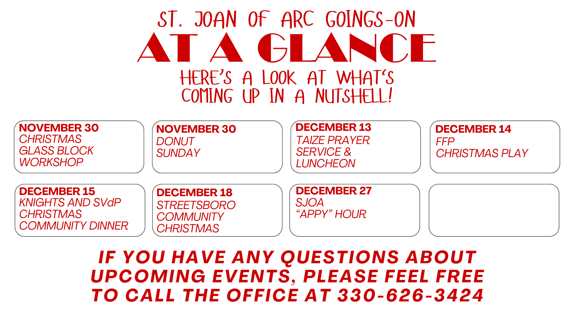 Whether you're already a parishioner, or a visitor locally or from out of town, we wish you a heartfelt welcome. Thank you for visiting our website!  Here at St. Joan of Arc, we are a Catholic community open to all.  Our church offers many opportunities to be involved, which you can find here on our website.  Most importantly, we invite you to join us at our masses for fellowship, and worship of our Lord Jesus Christ.