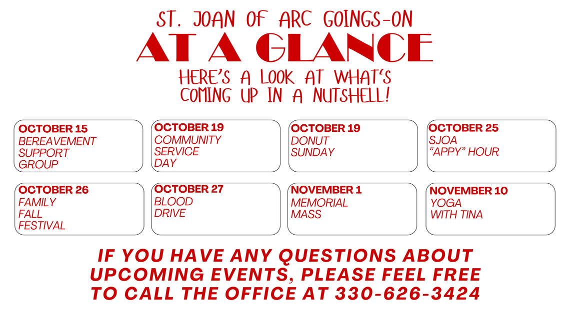 Whether you're already a parishioner, or a visitor locally or from out of town, we wish you a heartfelt welcome. Thank you for visiting our website! Here at St. Joan of Arc, we are a Catholic community open to all. Our church offers many opportunities to be involved, which you can find here on our website. Most importantly, we invite you to join us at our masses for fellowship, and worship of our Lord Jesus Christ.
